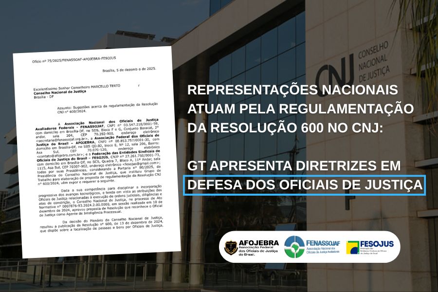 As representações nacionais dos Oficiais de Justiça – Afojebra, Fenassojaf e Fesojus-BR – intensificaram, nas últimas semanas, a atuação conjunta pela regulamentação da Resolução nº 600/2024 do Conselho Nacional de Justiça (CNJ). A norma dispõe sobre a atividade de inteligência processual e a localização de pessoas no âmbito do Poder Judiciário, atribuindo papel estratégico aos Oficiais de Justiça na busca da efetividade das decisões judiciais.